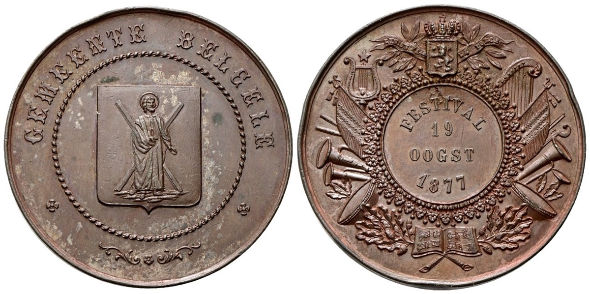 Dr. GEMENTE GELGELE. San Andrea stante con la croce. Rv. FESTIVAL / 19 / OOGST / 1877. Iscrizione disposta su quattro righe entro cerchio lineare; attorno, strumenti musicali.