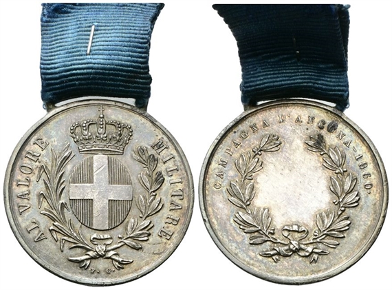 Vittorio Emanuele II, 1849-1878. Medaglia 1860 al valore militare Campagna d’Ancona opus G. Ferraris.