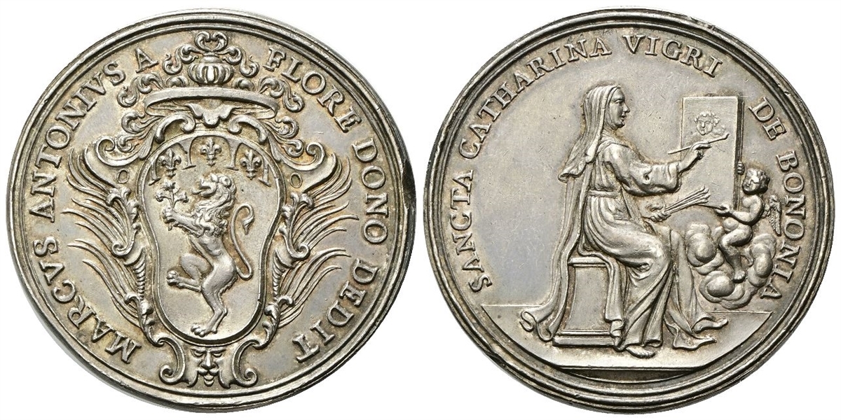Dr. MARCVS ANTONIVS A - FLORE DONO DEDIT. Stemma Fiori coronato tra due rami di palma. Rv. SANCTA CATHARINA VIGRI - DE BONONIA. La Santa seduta verso d., dipinge una tela retta da un cherubino tra le nubi.