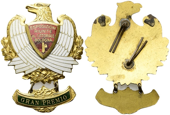 Dr. Aquila volta verso s.; sul petto, ESPOSIZIONI / RIUNITE / AL LITTORIALE / BOLOGNA / fascio con scure, iscrizione disposta su cinque righe entro scudetto; sotto, targa con la scritta: GRAN PREMIO.