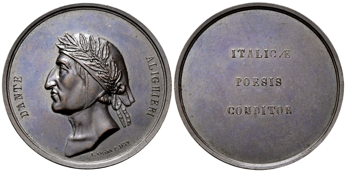 Dr. DANTE - ALLIGHIERI. Busto laureato del Poeta a s.; sotto, L COSSA 1819. Rv. ITALICAE / POESIS / CONDITOR. Iscrizione disposta su tre righe.