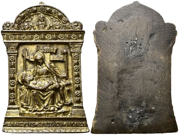 Dr. Placchetta con contorno sagomato a forma di pala d’altare, con predella modellata, colonne laterali, fregio decorato e lunetta. Al centro, La Vergine, seduta, tiene in grembo il corpo del Cristo morto nella tradizionale posa della Pietà; dietro il Gruppo, la croce con l'iscrizione INRI; ai lati della croce, la lancia e la canna con la spugna imbevuta di aceto; in esergo, sulla predella, SANCTVS SALVATOR MONDI; sulla lunetta, busto di Cristo risorto tra due teste di Cherubini.