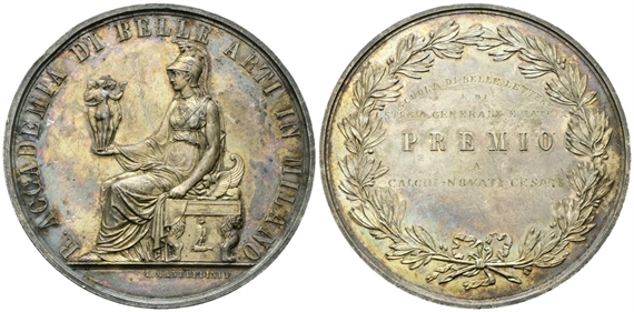 Dr. R ACCADEMIA DI BELLE ARTI IN MILANO. Minerva seduta tiene con la mano s. le tre grazie; sotto, L MANFREDINI. Rv. SCUOLA DI BELLE LETTERE / E DI / STORIA GENERALE E PATRIA / PREMIO / A / CALCHI NOVATI CESARI. Iscrizione parzialmente incisa disposta su sei righe tra due rami di alloro.