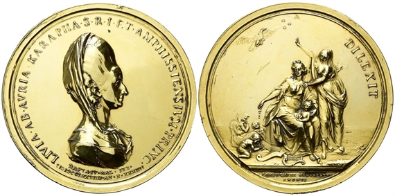 Dr. LIVIA AB AVRIA KARAPHA S R I ET AMPHISSIENSIVM PRINC. Busto della Principessa a d.; sotto, RAPTA IV KAL FEB / CICICCC LXXVIIII AN N XXXIIII. Rv. DILEXIT. La Carità seduta stringe Imeneo al fianco e dona ai poveri delle monete; al suo fianco, la Religione le indica nel cielo un’aquila con due aquilotti fra gli artigli; in alto, tre stelle e l’emblema del sole; ai suoi piedi, una torcia accesa,