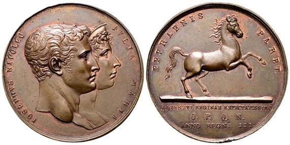 Dr. IOSEPHVS NAPOLEO - IVLIA MARIA. Teste affiancate a d. del Re e della Regina. Rv. EFFRAENIS - PARET. Il cavallo sfrenato, emblema di Napoli; in esergo, ADVENTVI REGINAE EXPECTATISSIMO / O P Q N / ANNO REGNI III.