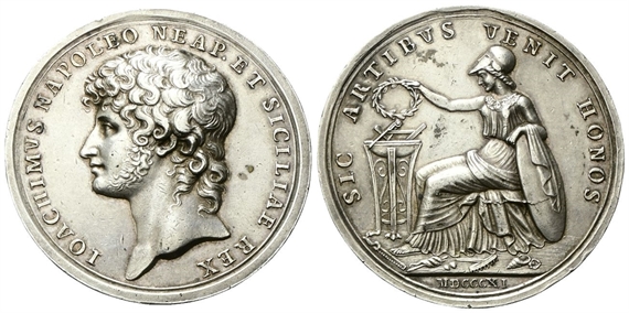 Dr. IOACHINVS NAPOLEO NEAP ET SICILIAE REX. Testa nuda a s. Rv. SIC ARTIBVS VENIT HONOS. Minerva galeata, seduta verso s., posa una corona di alloro su di un tripode e poggia l'avambraccio s. su di uno scudo; in esergo, MDCCCXI.