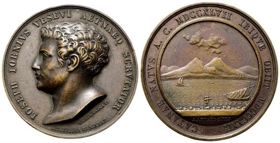 Dr. IOSEPH IOENIVS VESEVI AETNAEQ SCRVTATOR. Testa a s.; sotto, V CATENACCI F. Rv. CATANAE NATVS A C MDCCXLVII IBIQUE OBIIT MDCCCXXII. Il Golfo di Napoli; in esergo, A ARNAVD SCVLP.