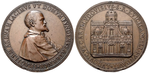 Dr. FRAGILEM ARENAM IACIMVS VT DOMVM FVNDEMVS ÆTERNAM. Busto a d., con mozzetta. Rv. LVDOVICVS CARD LVDOVISIVS SRE VICECANCELL FVNDAVIT. Veduta della Chiesa; in esergo, AN MDCXXVI.