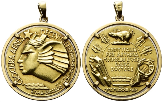 Dr. CROCIERA AEREA - DEL DECENNALE / ROMA CHICAGO NEW-YORK ROMA. Testa stilizzata a s., turrita e con stella sul capo, allegorica dell'Italia. Rv. REDIT ITALIA / PER AETHERA / MVSSOLINI DVCE / BALBO / DVCTORE. Iscrizione su cinque righe, compresa tra grattacieli a s. e il Colosseo e l'arco di Tito a d., il mare in basso, aerei sul bordo; in esergo, sotto a fascio orizzontale, MCMXXXIII XI.