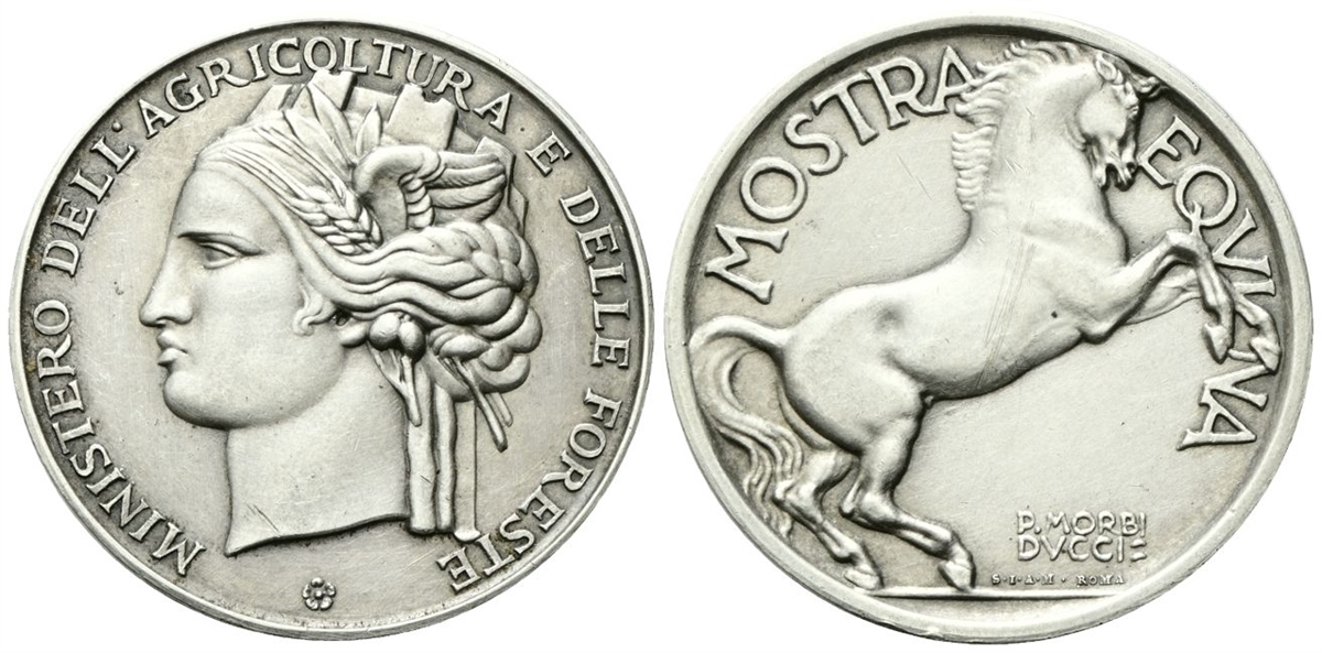 Dr. MINISTERO DELL’AGRICOLTURA E DELLE FORESTE. Testa dell’Italia turrita con spighe di grano; sotto, rosetta. Rv. MOSTRA - EQVINA. Cavallo rampante a d.; a d., P MORBI / DVCCI; sopra la linea di esergo, S I A M ROMA.