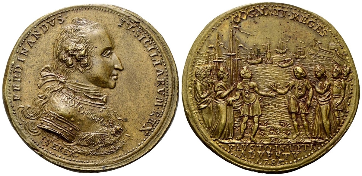 Dr. FERDINANDVS - IV SICILIARVM REX. Busto corazzato a d.; sotto la troncatura del busto, I VEBER COGNATI.REGES (I Re cognati) Rappresentazione dell'incontro dei Reali con la famiglia ducale di Toscana al loro arrivo a Livorno; sullo sfondo il porto con le navi ancorate; all'esergo, FAVSTO.IN.HETR / ADVENTV / 1785 (Nel fausto arrivo in Etruria).