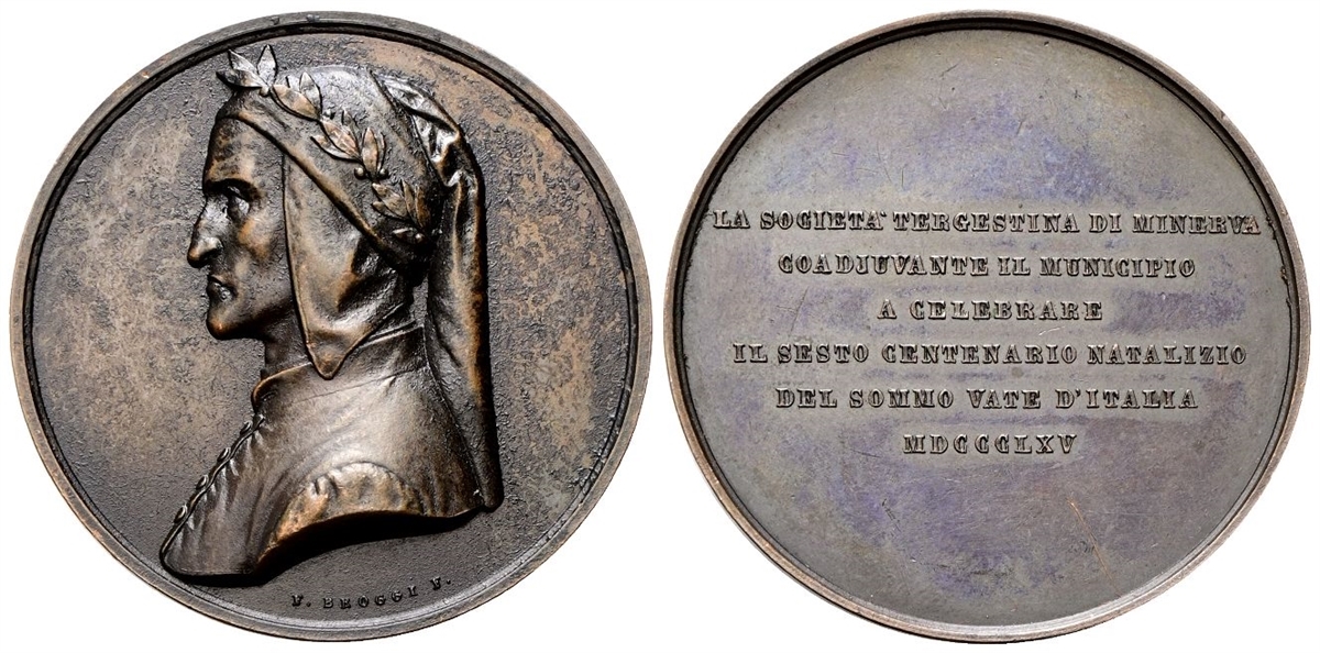 Dr. Busto laureato del Poeta a s.; sotto la troncatura della spalla; F BROGGI F. Rv. LA SOCIETA’ TERGESTINA DI MINERVA / COADJUVANTE IL MUNICIPIO / A CELEBRARE / IL SESTO CENTENARIO NATALIZIO / DEL SOMMO VATE D’ITALIA / MDCCCLXV. Iscrizione disposta su sei righe.