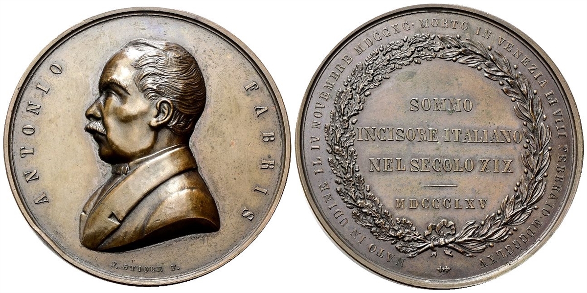 Dr. ANTONIO - FABRIS. Busto a d.; sotto, F STIORE F. Rv. NATO IN UDINE IL IV NOVEMBRE MDCCXC MORTO IN VENEZIA LI VIII FEBBRAIO MDCCCLXV. SOMMO / INCISORE ITALIANO / NEL SECOLO XIX / MDCCCLXV. Iscrizione disposta su quattro righe.