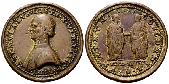 Antonio Da Mula fu patrizio veneziano che prestò servizio in vari importanti uffici dell’amministrazione veneziana, anche come membro del Consiglio dei Dieci. Nel 1536 fu nominato duca del Regno di Candia e divenne responsabile del governo di Creta. Nel giugno del 1538, con il capitano Marcantonio Trevisan, organizzò la difesa di Candia contro la minaccia del pirata turco Barbarossa. Nonostante le risorse inadeguate, i due veneziani riuscirono a mettere in fuga il nemico. Si ritiene che l’immagine del rovescio con Da Mula e Trevisan che si stringono la mano in concordia fraterna commemori proprio questa occasione. Il capitano MarcantonioTrevisan sarebbe poi stato eletto doge di Venezia nel 1553.