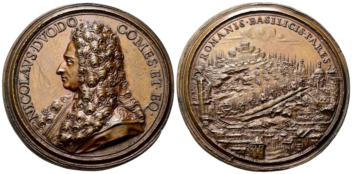 Dr. NICOLAVS DVODO - COMES ET EQ. Busto a s. con lunga parrucca; sotto, IO ORTOL F. Rv. ROMANIS BASILICIS PARES (Pari alle basiliche romane). Veduta di Monselice, del Santuario delle Sette Chiese e della Rocca.