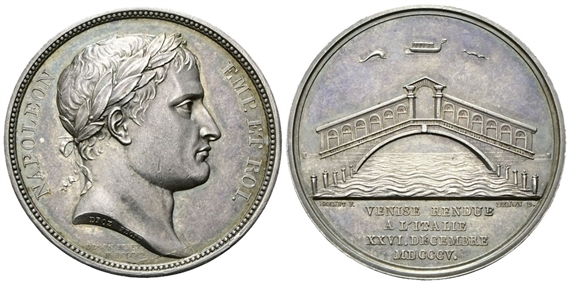 Dr. NAPOLEON EMP - ET ROI. Testa laureata a d.; sulla troncatura del collo, DROZ FECIT; sotto, DENON DIREX / MDCCCVI. Rv. Veduta del ponte di Rialto; in esergo, VENISE RENDUE / A L’ITALIE / XXVI