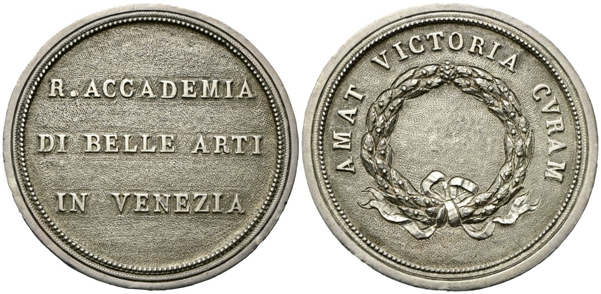 Dr. R ACCADEMIA / DI BELLE ARTI / IN VENEZIA. Rv. AMAT VICTORIA CVRAM. Corona formata da due rami di alloro uniti in basso da un nastro.