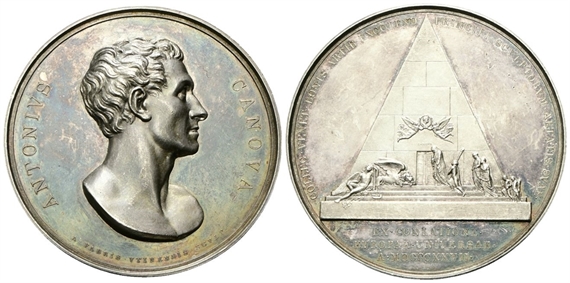 Dr. ANTONIVS - CANOVA. Busto a d.; sotto, A FABRIS VTINENSIS SCVLP. Rv. COLLEG VENET BONIS ARTIBVS EXCOLEND PRINCIPI SCVLPTORVM AETATIS SVAE. Rappresentazione del monumento funebre dell’artista; sopra la porta della piramide, CANOVA; in esergo, EX CONLATIONE / EVROPAE VNIVERSAE / A MDCCCXXVII.