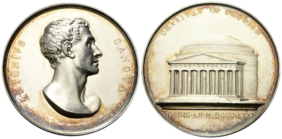 Dr. ANTONIVS - CANOVA. Busto a d.; sotto, A FABRIS VTINENSIS SCVLP. Rv. CHARITAS IN PATRIAM. Prospetto del Pantheon; in esergo, DEDIG AN MDCCCXXXI.