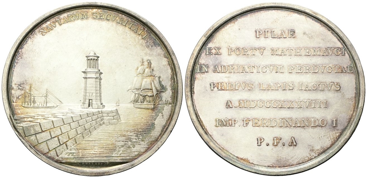 Dr. NAVTARVM SECVRITATI. Veduta del porto di Malamocco col mare solcato da navi; in esergo, L FERRARI F. Rv. PILAE / EX PORTV MATHEMAVCI / IN ADRIATICVM PERDVCTAE / PRIMVS LAPIS IACTVS / A MDCCCXXXVIII / IMP