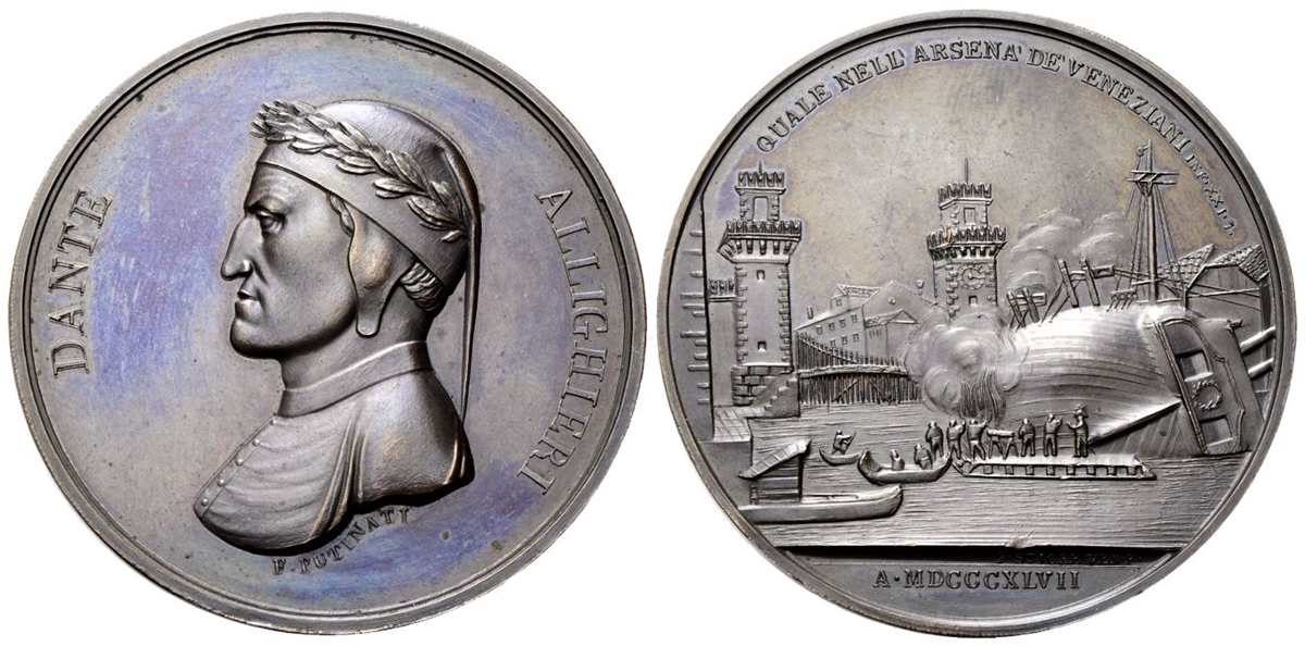 Dr. DANTE - ALLIGHIERI. Busto laureato del Poeta a s.; sotto, F. PUTINATI. Rv. QUALE NELL’ARSENA’ DE’ VENEZIANI INF. XXI 7. Veduta di parte dell’Arsenale di Venezia; in esergo, F STIORE VEN F / A MDCCCXLVII.
