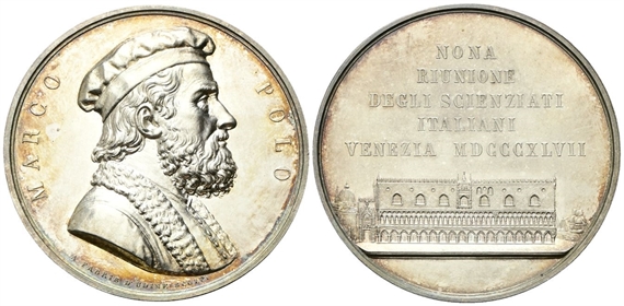 Dr. MARCO - POLO. Busto a d., con copricapo; sotto, A FABBRIS D’UDINE SCOLPì. Rv. NONA RIUNIONE DEGLI SCIENZIATI ITALIANI VENEZIA MDCCCXLVII. Prospetto del Papazzo Ducale dal Canal Grande.