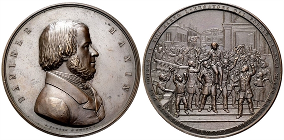 Dr. DANIELE - MANIN. Busto a d.; sotto la troncatura del busto, A FABRIS D’UDINE F. Rv. LIBERATO DAL POPOLO IL XVII MARZO XVII MARZO LIBERATORE DEL POPOLO IL XXII MARZO MDCCCXLVIII / VENEZIA. Manin portato in trionfo dal popolo.