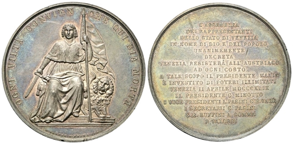 Dr. OGNI VILTA’ CONVIEN CHE QUI SIA MORTA. La Repubblica di Venezia, seduta di fronte con vessillo e spada, di fianco il leone alato di San Marco co Vangelo Chiuso. A FABRIS D’UDINE FECE. Rv. L’ASSEMBLEA / DEI RAPPRESENTANTI / DELLO STATO DI VENEZIA / IN NOME DI DIO E DEL POPOLO / UNANIMANENTE / DECRETA / VENEZIA RESISTERà ALL’AUSTRIACO / AD OGNI COSTO / A TALE SCOPO IL PRESIDENTE MANIN / E’INVESTITO DI POTERI ILLIMITATI / VENEZIA II APRIL