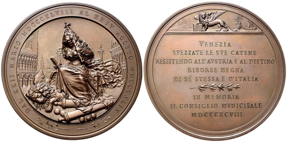 Dr. DAL XXII MARZO MDCCCXLVIII AL XXIV AGOSTO MDCCCXLIX. Venezia seduta verso s., testa a d., regge una bandiera con la mano s. e una spada spezzata con la d.; sullo sfondo, il Palazzo Ducale e la Zecca, le colonne della Piazzetta e il campanile di San Giorgio; ai suoi piedi, il leone di San Marco e cannoni con proiettili; sotto, V FAGGIOTTO DIS C INC - JOHNSON MILANO. Rv. Il leone di San Marco andante verso s.,regge con una zampa il Vangelo; davanti, una fortezza; dietro, due navi; in esergo, VENEZIA / SPEZZATE LE SVE CATENE / RESISTENDO ALL’AVSTRIA E AL DESTINO / RISORSE DEGNA / DI SE’ STESSA E D’ITALIA / IN MEMORIA /