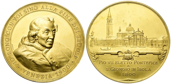 del monastero annesso; davanti, le acque solcate da gondole; in esergo, PIO VII ELETTO PONTEFICE / A / S GIORGIO IN ISOLA / 1800.