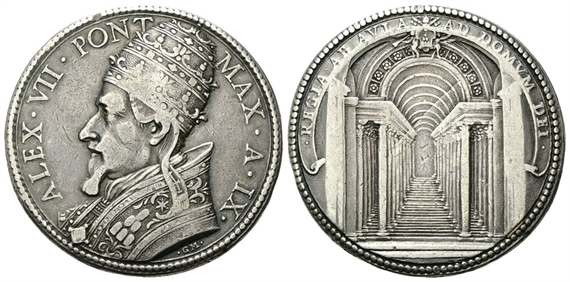 Dr. ALEX VII PONT - MAX A IX. Busto a s., con camauro, mozzetta e stola; sull taglio della spalla, G M. Rv. REGIA AB AVLA - AD DOMVM DEI. Ingresso della scala regia nel Vaticano opera di G. L. Bernini.
