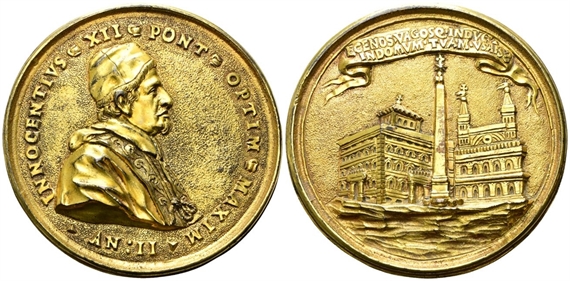 Dr. INNOCENTIVS XII - PONT OPTIM MAXIM AN II. Busto a d. con camauro,mozzetta e stola con decorazioni floreali. Rv. EGOS VAGOS INDVC IN DOMVM TVAM VSAI 58 (entro cartiglio). Veduta della piazza con la Basilica Lateranense con l’obelesco al centro.