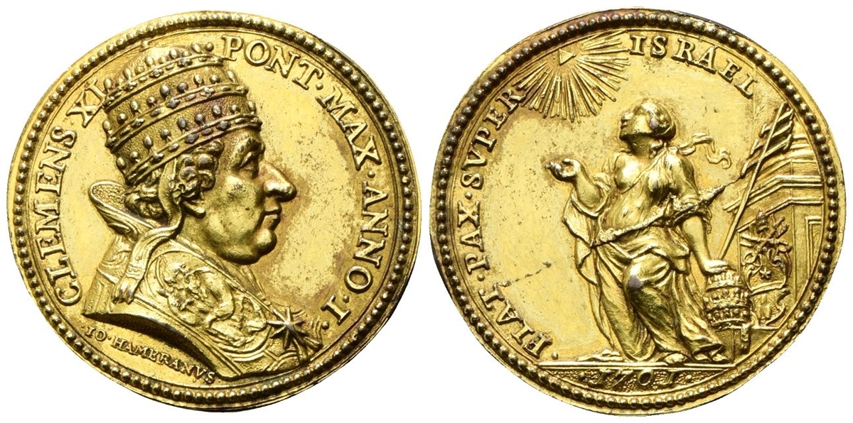 Dr. CLEMENS XI - PONT MAX ANNO I. Busto a d., con triregno e piviale decorato; sotto la troncatura della spalla, IO HAMERANVS. Rv. FIAT PAX SVPER - ISRAEL. La Chiesa inginocchiata verso s. irradiata dall’occhio divino poggia la mano sul triregno; in esergo, 1701.