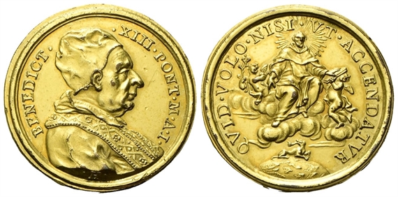 Dr. BENEDICT - XIII PONT M A I. Busto a d. con camauro, mozzetta e stola; sotto la troncatura della spalla, H. Rv. QVID VOLO NISI - VT ACCENDATVR. San Domenico sulle nubi tra due angioletti; sotto, cane sdraiato sul globo con torcia accesa in bocca.