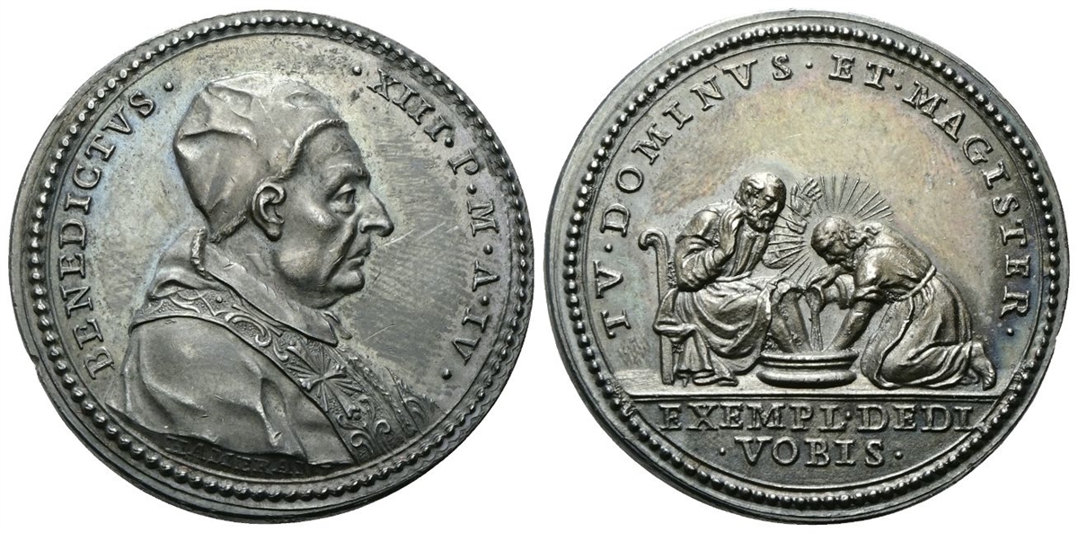 Dr. BENEDICTVS - XIII P M A IV. Busto a d. con camauro, mozzetta e stola decorata da croce raggiante; sotto la troncatura della spalla, HAMERANI. Rv. TV DOMINVS ET MAGISTER. Lavanda dei piedi; in esergo, EXEMPL DEDI / VOBIS.