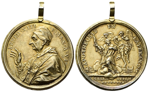 Dr. BENED XIII - P MAX A VI. Mezzobusto a s. con camauro, mozzetta e stola ornata con croce e fiorami; nel taglio del braccio, HAMERAN. Rv. APOTHEOSIS - IN - LATERANO. San Giovanni Nepomuceno ascende al cielo incoronato da un angelo alle sue spalle; sullo sfondo, alcuni monumenti di Roma; in esergo, S IOAN - NEPOM / MDCCXXIX.