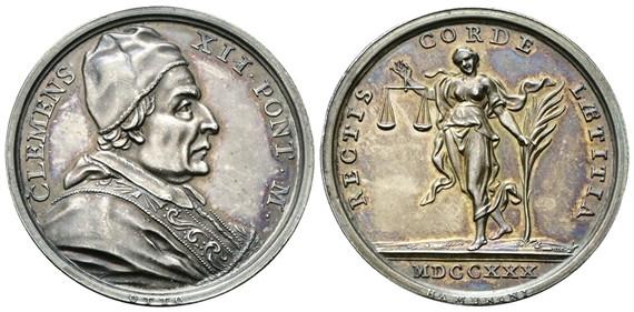 Dr. CLEMENS - XII PONT M. Busto del Pontefice a destra con camauro, mozzetta e stola ornata con croce; sul bordo, OTTO. Rv. RECTIS - CORDE - LAETITIA. La Giustizia sostiene una bilancia e regge una palma; in esergo, MDCCXXX; sul bordo, HAMERANI.
