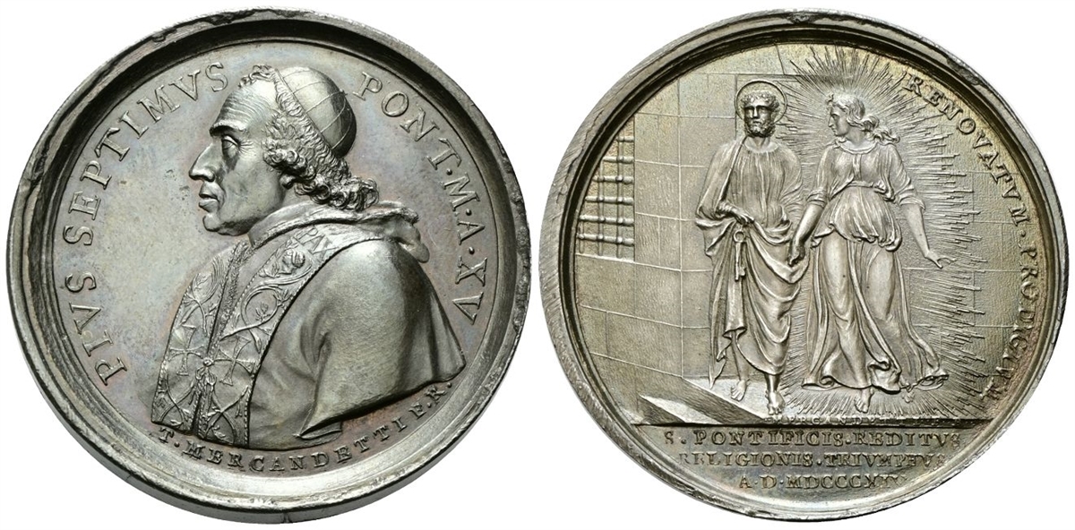 Dr. PIVS SEPTIMVS - PONT M A XV. Busto a d. con zucchetto e piviale; sotto, T MERCANDETTI F R. Rv. RENOVATVM - PRODIGIVM. Angelo libera San Pietro nimbato dal carcere; in esergo, S PONTIFICIS AEDITVS / RELIGIONIS TRIVMPHVS / A D MDCCCXIV.
