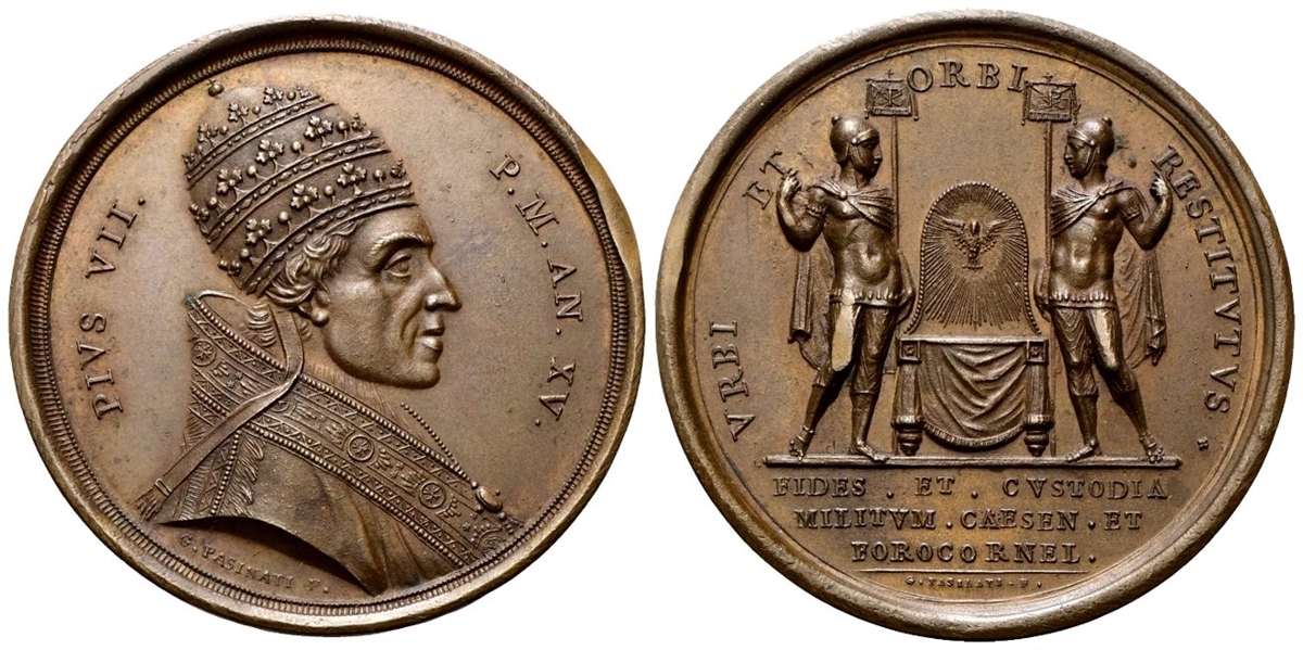 Dr. PIVS VII - P M AN XV. Busto a d., con triregno e piviale; sotto la troncatura della spalla, G PASINATI F. Rv. VRBI ET - ORBI - RESTITVTVS. Il trono papale illuminato dalla Colomba dello Spirito Santo; ai lati, due guerrieri; in esergo, FIDES ET CVSTODIA / MILITVM CAESEN ET / FORO CORNEL / G PASINATI F.