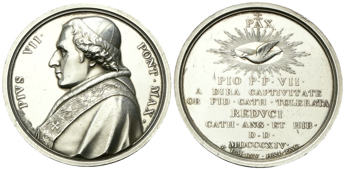 Dr. PIVS VII - PONT MAX. Busto a d. con triregno e piviale; sotto, HALLIDAY F. Rv. PIO P P VII / A DIRA CAPTIVITATE / OB FID CATH TOLERATA / REDVCI / CATH ANG ET HIB / D D /MDCCCXIV / I M INV H& L EXC. Iscrizione disposta su otto righe; sopra, PAX / Colomba dello Spirito Santo.