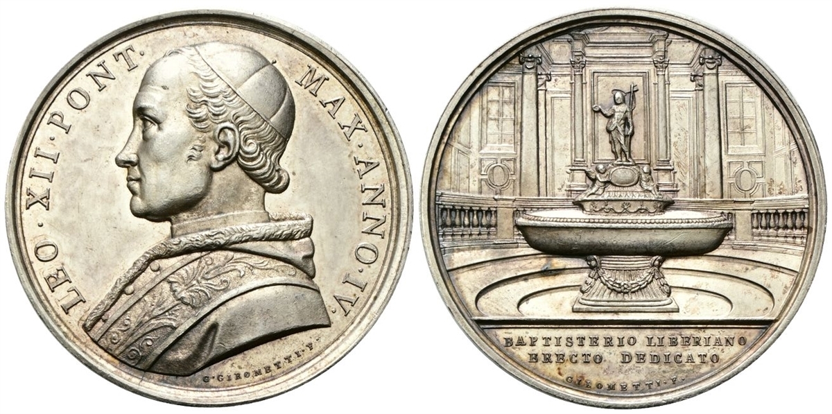 Dr. LEO XII PONT - MAX ANNO IV. Busto a s. con berretto, mozzetta e stola; sotto la tronctura del braccio, G GIROMETTI F. Rv. Fonte battesimale in Santa Maria Maggiore; in esergo, BAPTISTERIO LIBERIANO / ERECTO DEDICATO.