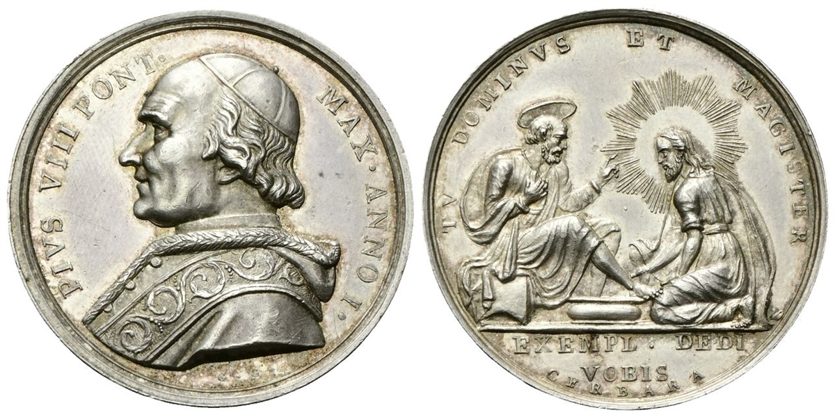 Dr. PIVS VIII PONT - MAX ANNO I. Busto a s., con berretto, mozzetta e stola: sotto, G G. Rv. TV DOMINVS ET MAGISTER. Gesù lava i piedi a S.Pietro; in esergo, EXEMPL DEDI / VOBIS; sotto, CFRBARA.