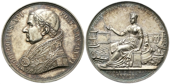 Dr. GREGORIVS XVI - PONT MAX AN VI. Busto a s. con berretto e piviale; sotto il taglio della spalla, CERBARA IOSEPH F. Rv. CENTVMCELL VRBE AMPLIFICATA. Civitavecchia turrita seduta verso s., indica il nuovo molo; in esergo, PORTV REDDITO / TVTIORE / IOSE CERBARA EXCVD.
