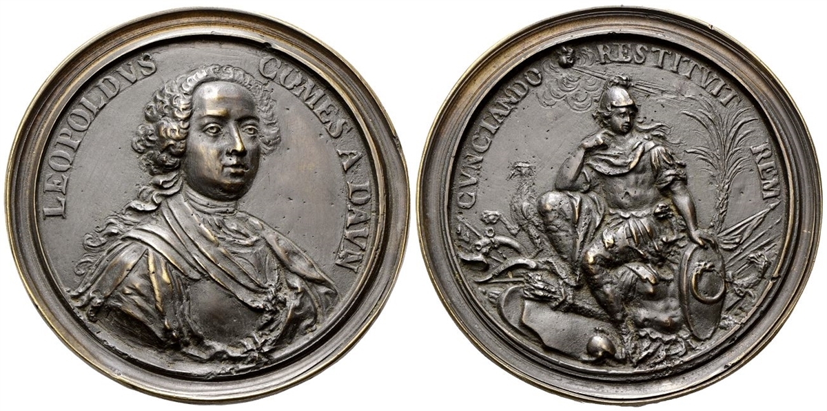 Dr. LEOPOLDVS - COMES A DAVN. Busto corazzato, drappeggiato, di scorcio, verso d., indossa la Gran Croce dell'Ordine di Maria Teresa. Rv. CVNCTANDO RETITVIT - REM. Fabius Cunctator nelle vesti di Marte, seduto verso s., su una pila di armi e armature, testa a d.; a s., aquila sullo sfondo; sopra, vento che spira.