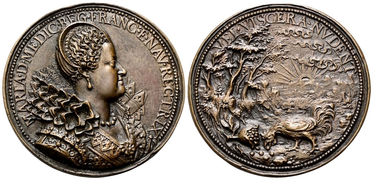 Dr. MARIA D MEDIC REG FRANC ET NAV RECTRIX. Busto a d. della Reggente in abito di corte. Rv. VEL VISCERA NVDENT. Un gallo che mangia i semi di un melograno aperto; a d., alberi; sullo sfondo, veduta agreste con sole nascente.