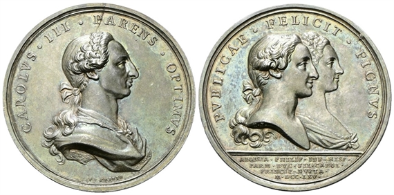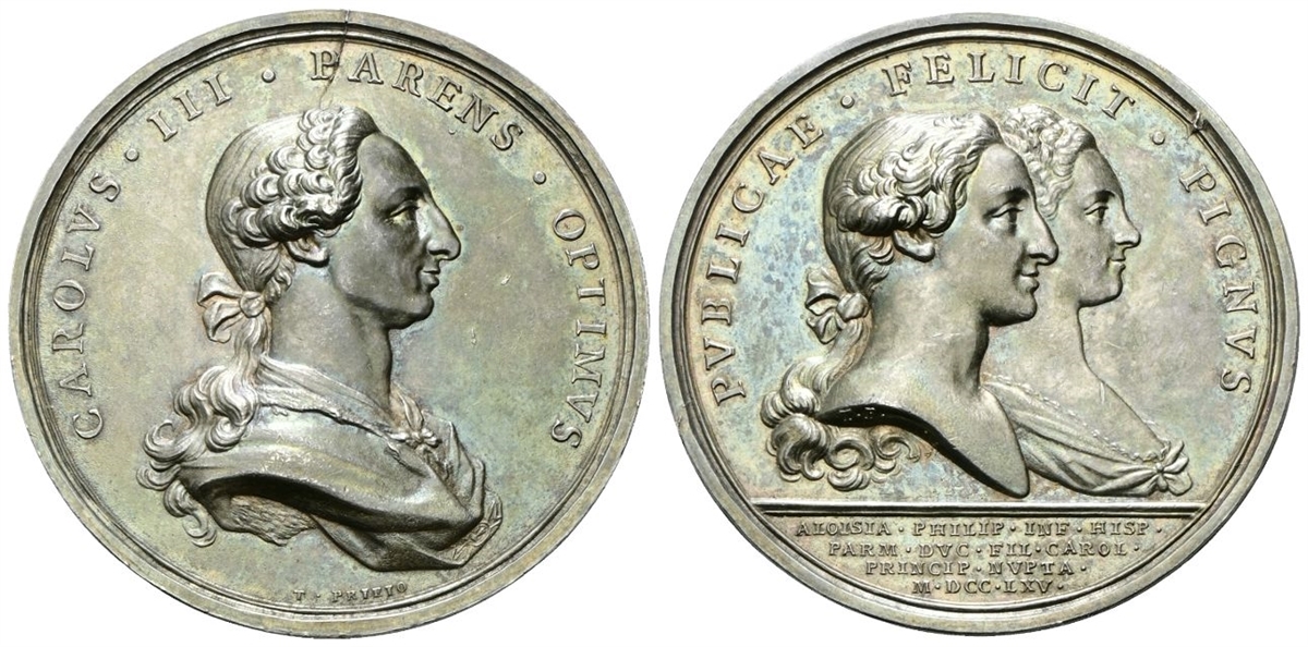 Dr. CAROLVS III PARENS OPTIMVS. Busto a d.; sotto, T PRIETO. Rv. PVBLICAE FELICIT PIGNVS. Busti accollati a d. di Carlo IV Borbone e di Maria Luisa di Spagna; in esergo, ALOISIA PHILIO INF HISP / PARM DVC FIL CAROL / PRINCIP NVPTA / M DCC LXV.