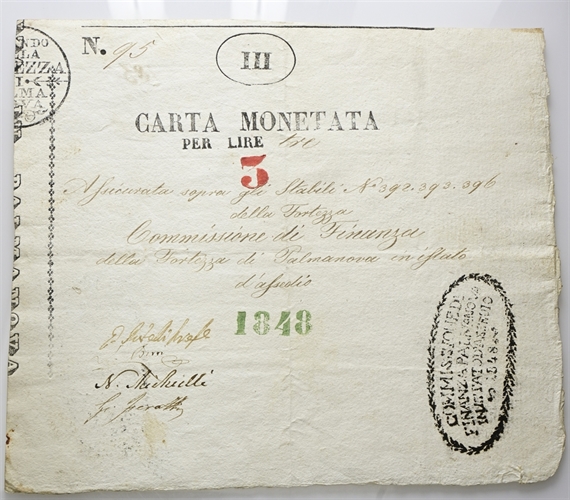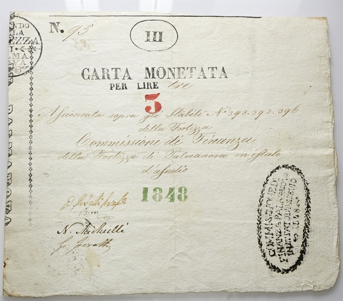 Prima Guerra d’Indipendenza-Assedio di Palmanova 3 Lira 1848, testo manoscritto.