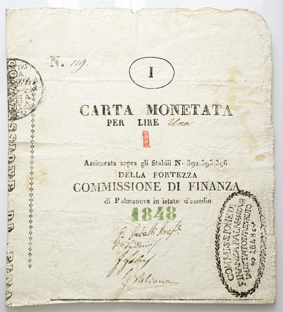 Prima Guerra d’Indipendenza-Assedio di Palmanova 1 Lira 1848, cifra manoscritta.