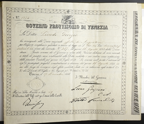 Governo Provvisorio della Repubblica Veneta. Buoni del Prestito, 1848-1849. Buoni del prestito di oggetti preziosi (di Venezia) decreto del 20 agosto 1848, visto 27 dic. 1848.