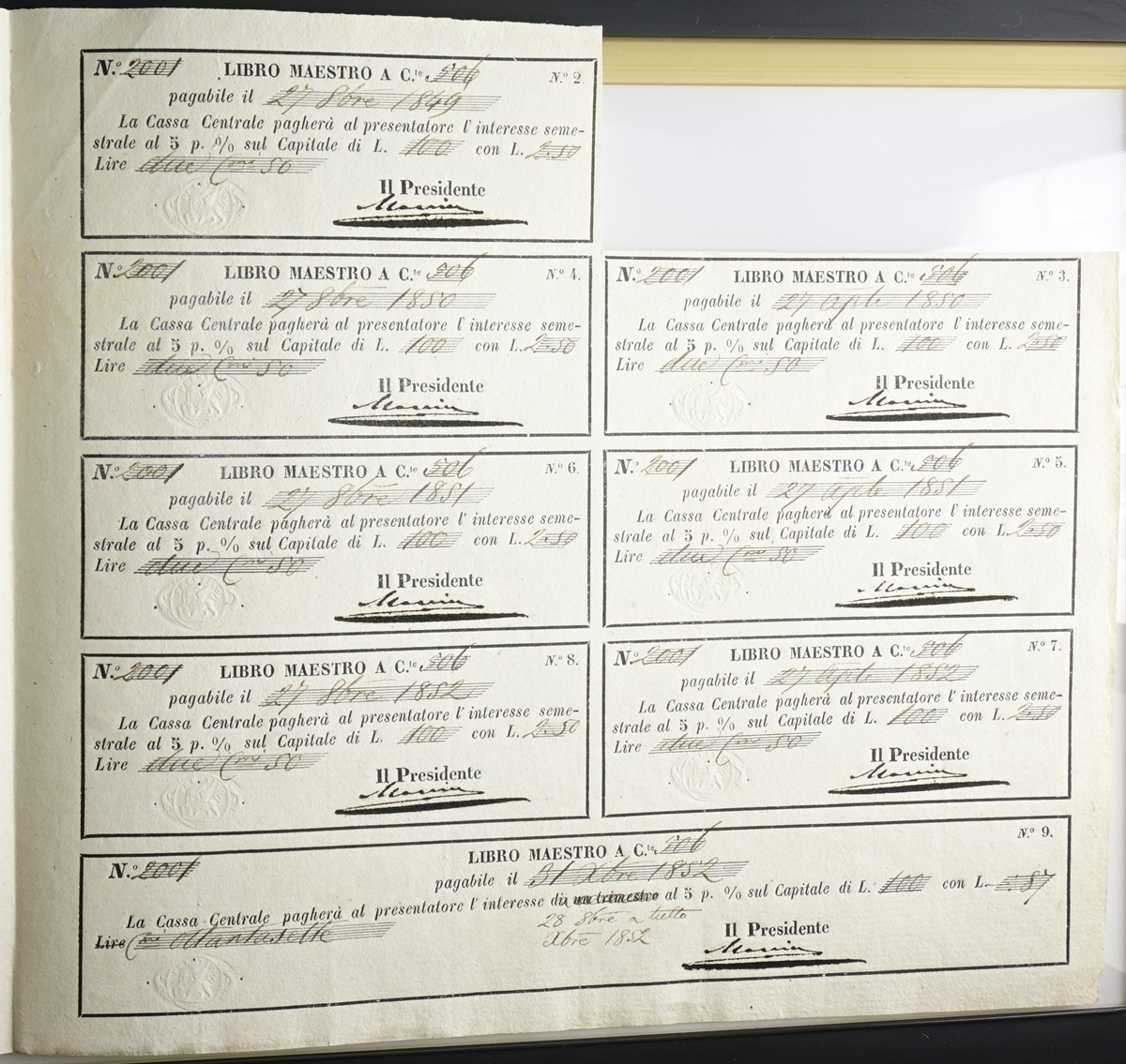 Firme di Manin come Presidente, del Capo Dipartimento delle Finanze e del Direttore emissione cedole.
